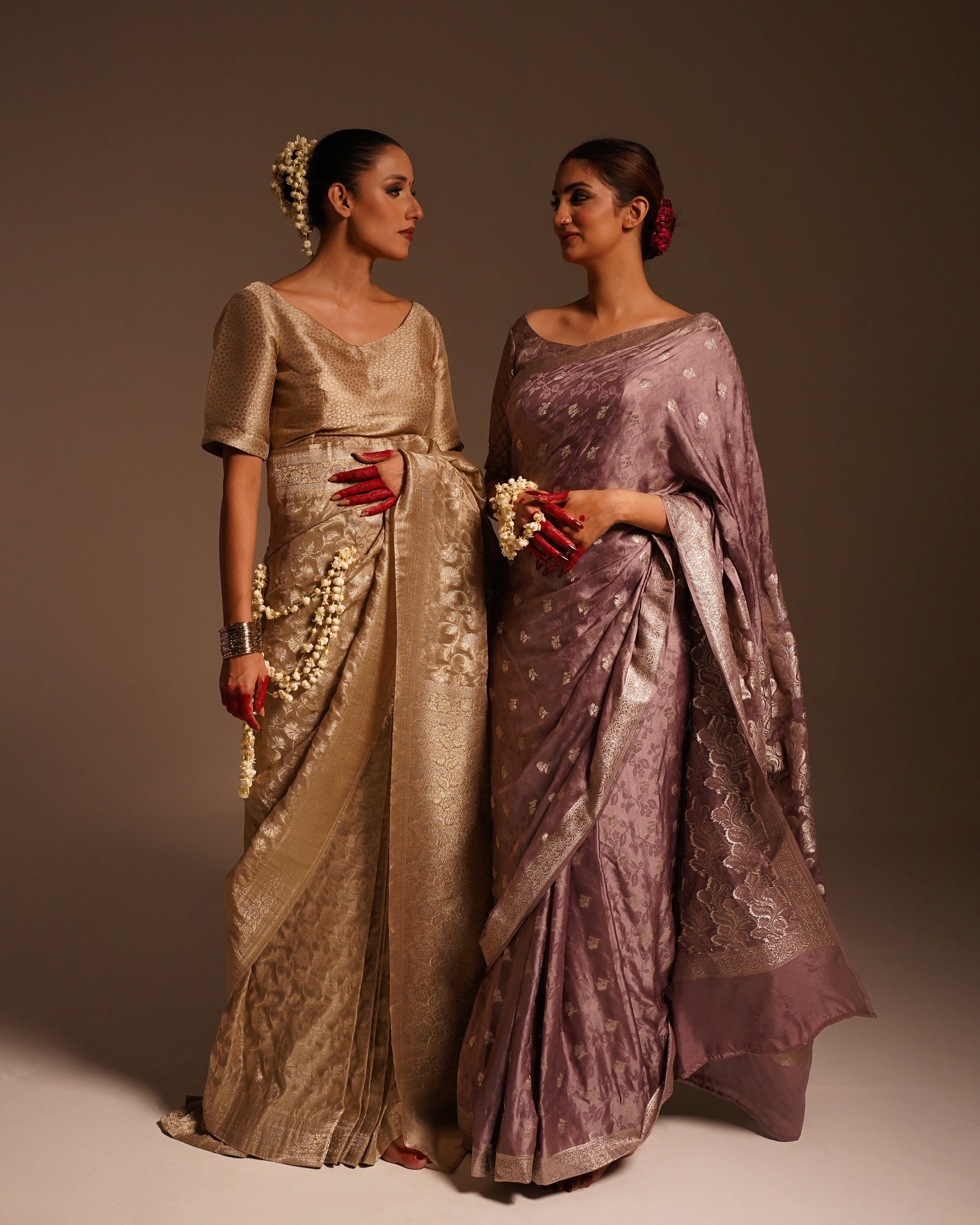 The gold zari adds to the richness of culture shown through the traditional drape of saree.