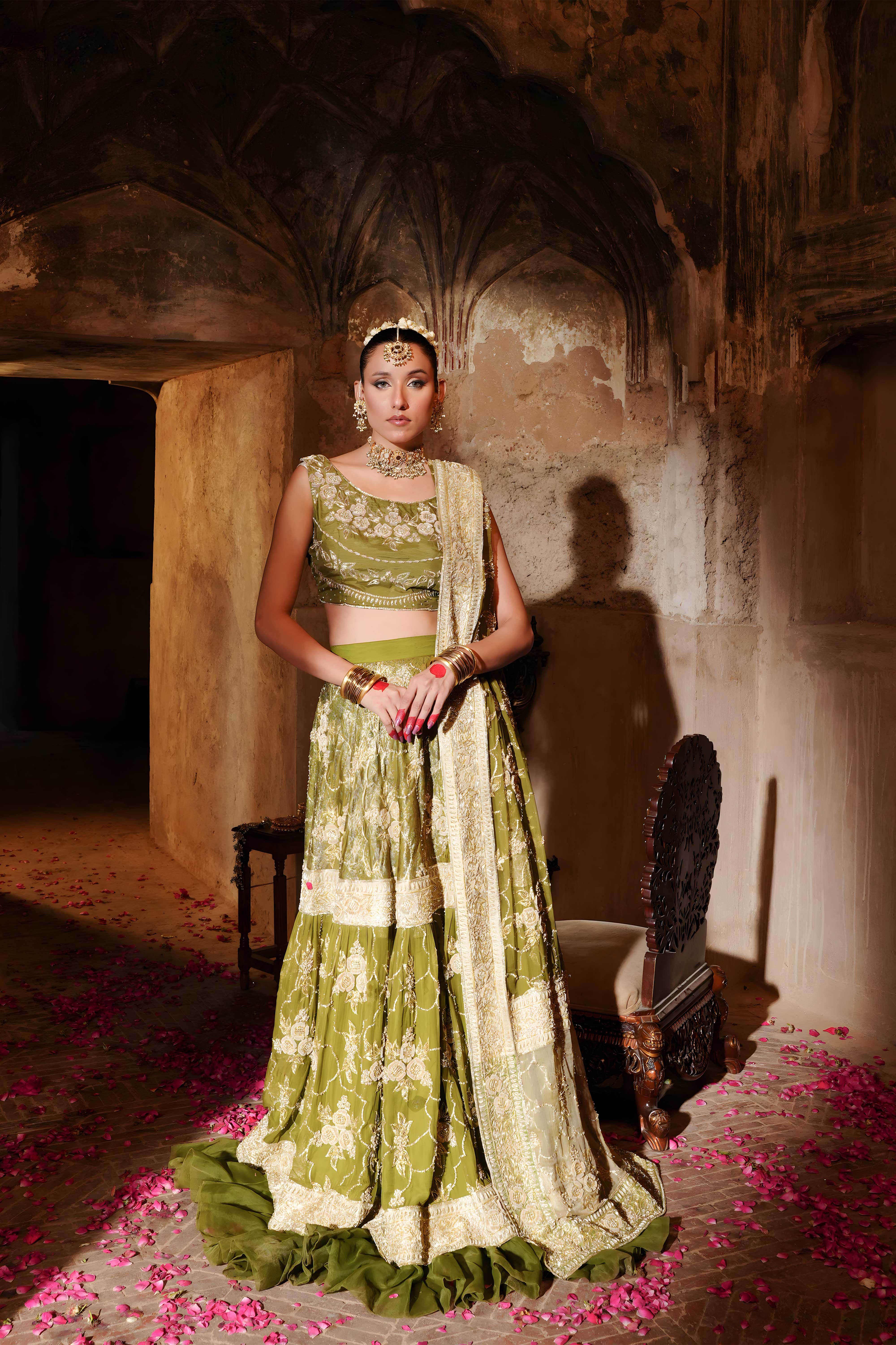 “Jahan Ara”, a combination of two colors mehndi green and beige, looks elegant. Two types of fabric, jamawar and pure chiffon, are used with organza raffle. Jamawar heavily embellished blouse and lengha is adorned with kora, dabka, zari and naqshi work. The Pure chiffon dupatta adds a touch of ethereal beauty to this stunning ensemble.