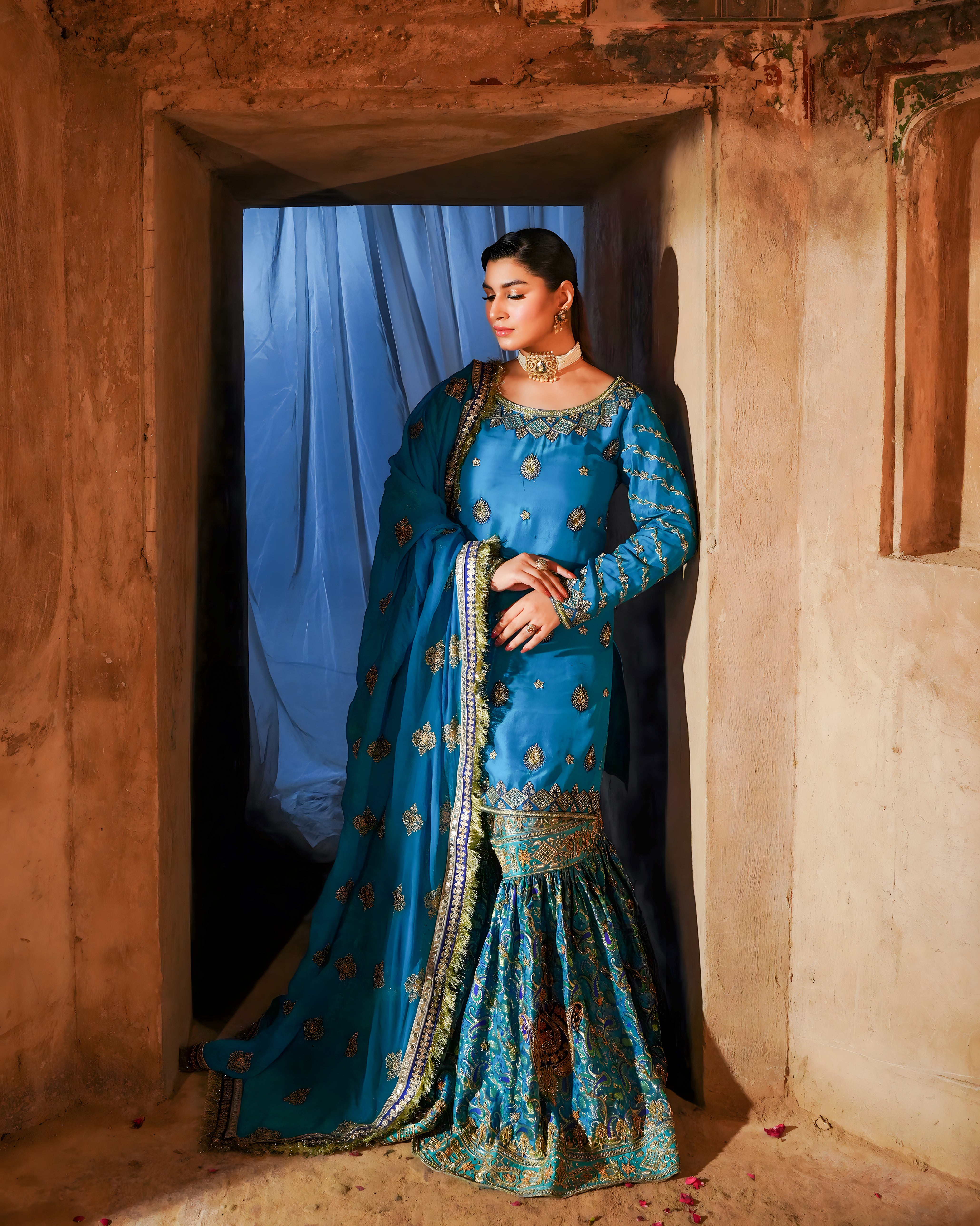 Wrapped in the tranquility of pre storm sky, this semble shimmers-like lightning about to stike. The ink blue shirt is embellished with golden colour that makes a dress royal like this colour. Jamawar Shara is heavily embellished with dabka zadozi, ari,and niqhi. pure chiffon dupatta is just like a queen in mist.Embellished with four side kiran used.