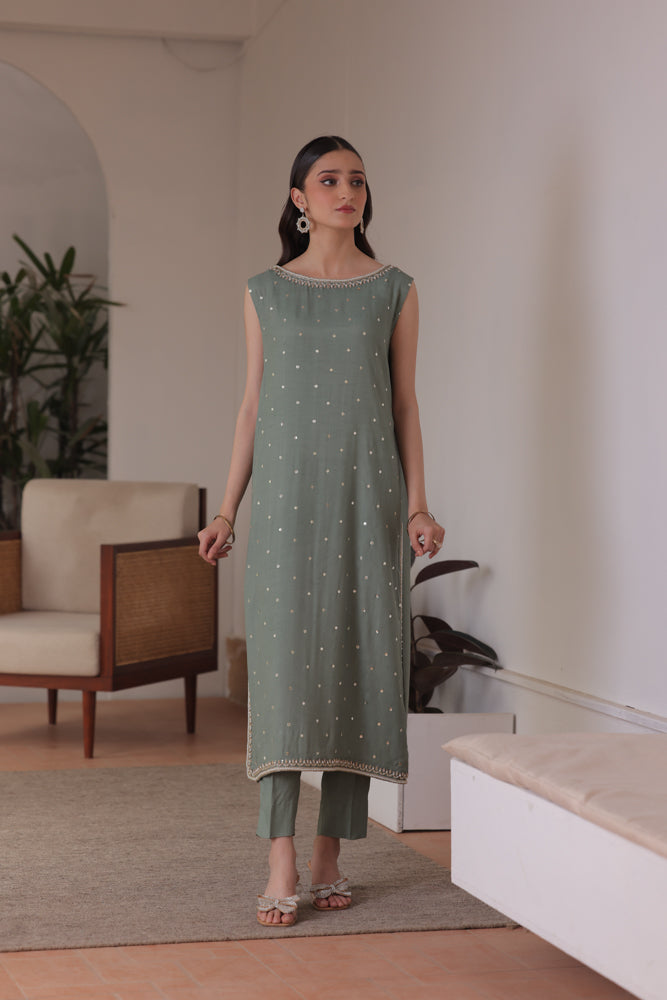 A mesmerising creation in sumptuous raw silk. Enriched with handcrafted dabka and enchanting pearl detailing, this dress presents timeless beauty. With its delicate detailing and graceful silhouette, “Daisy” is a testament to undeniable beauty. Step into the limelight with "Daisy," where each element whispers tales of elegance and charm.