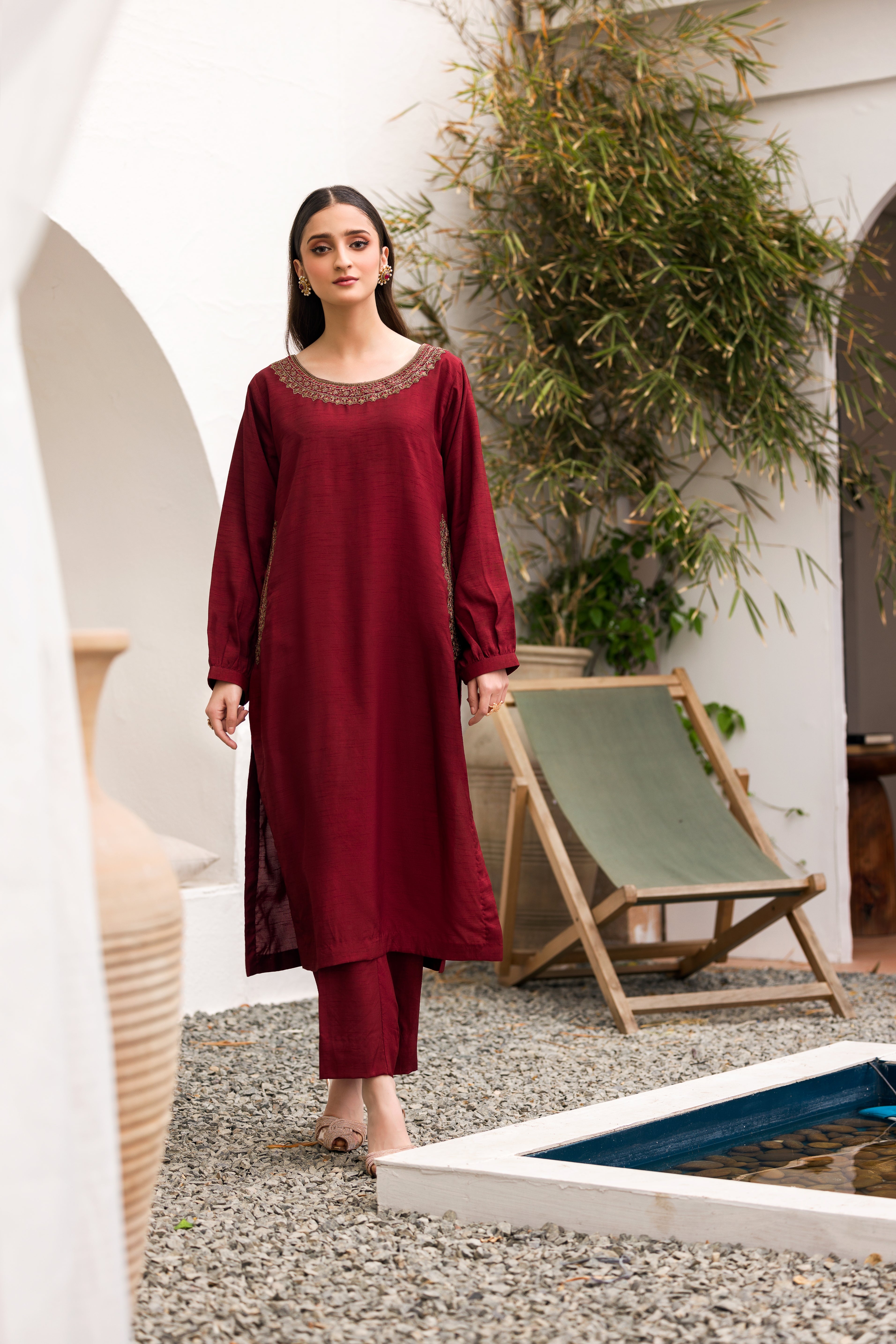 A divine creation in wine red korean raw Silk. This A-line shirt with cuff sleeves and detailed embroidery along the side pockets and neckline, radiates elegance at every turn. Step into regal sophistication with "Heer" and embrace the enduring allure of its exquisite craftsmanship.