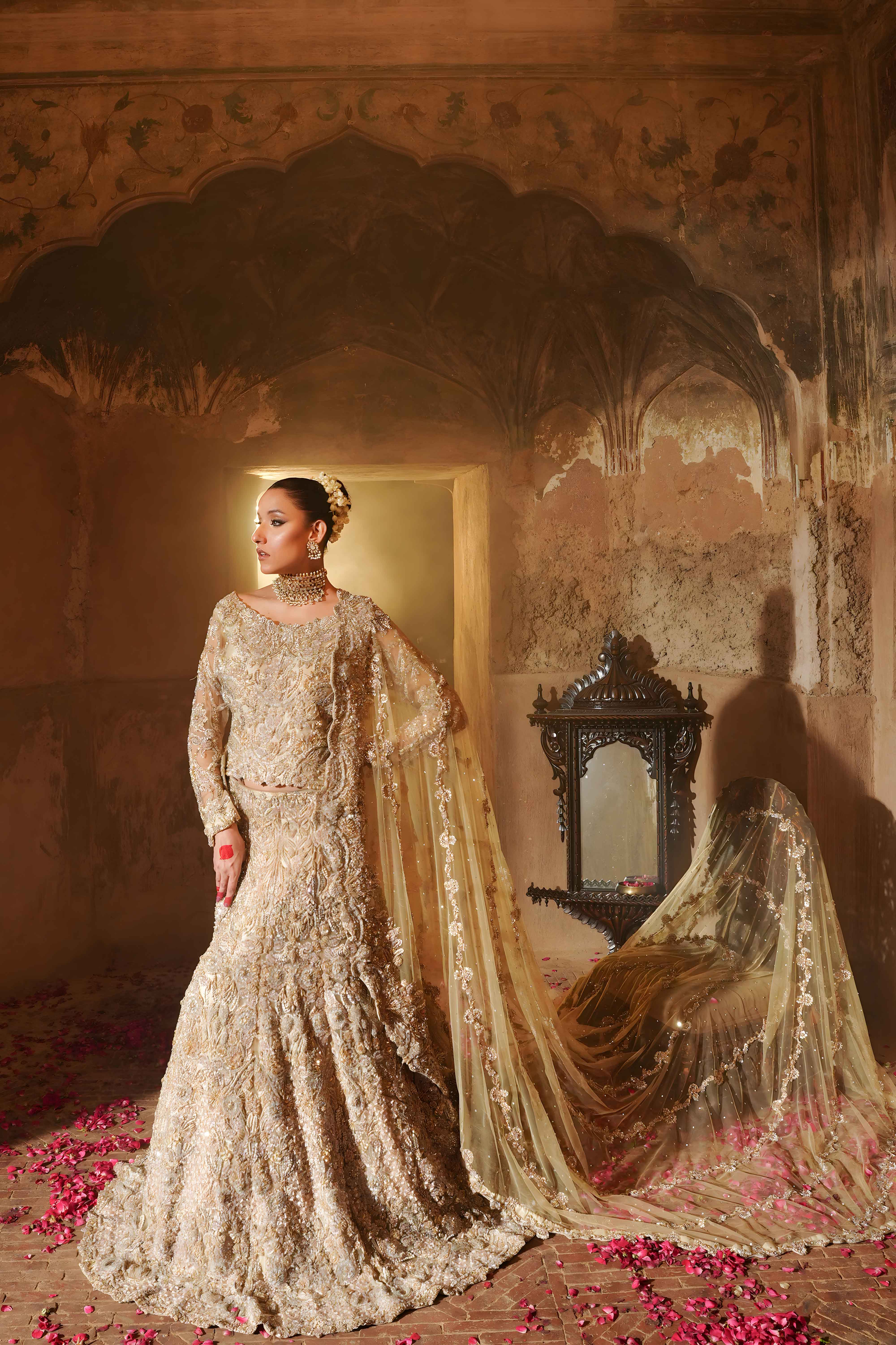 A celestial canvas this ivory ensemble exudes ethereal beauty.This meticulously embellished net blouse ,lengha, and net tail dupatta is Adorned with sequence, crystal pearls, zarri , dabka, kora, naqshi, and thread work.