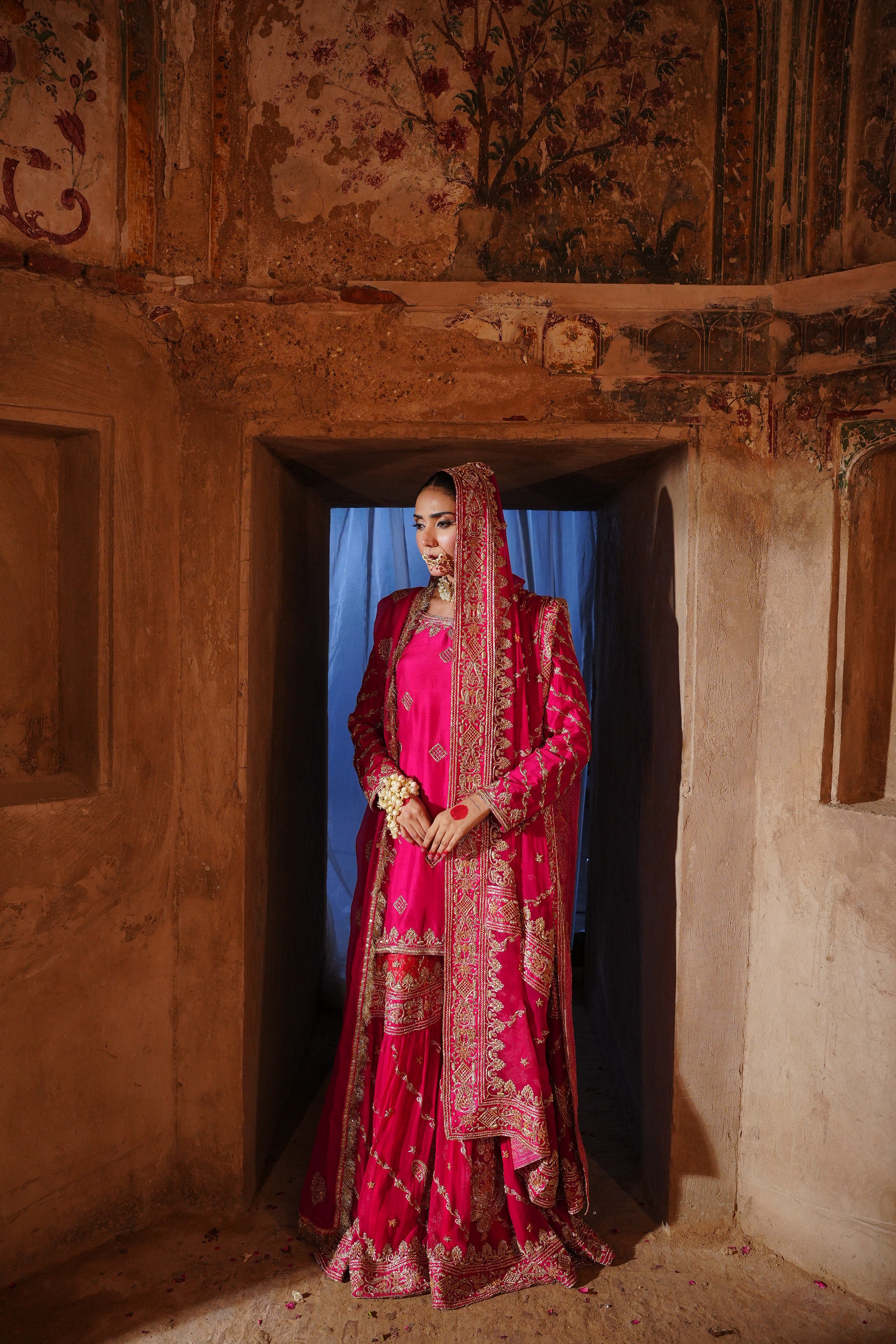 article is a vibrant bloom radiating confident feminity.it is as vibrating and captivating as vibrant flower.chiffon Fuschia pink dress is fully embellished. The dress is adorned with zari,naqshi ,dabka kora.