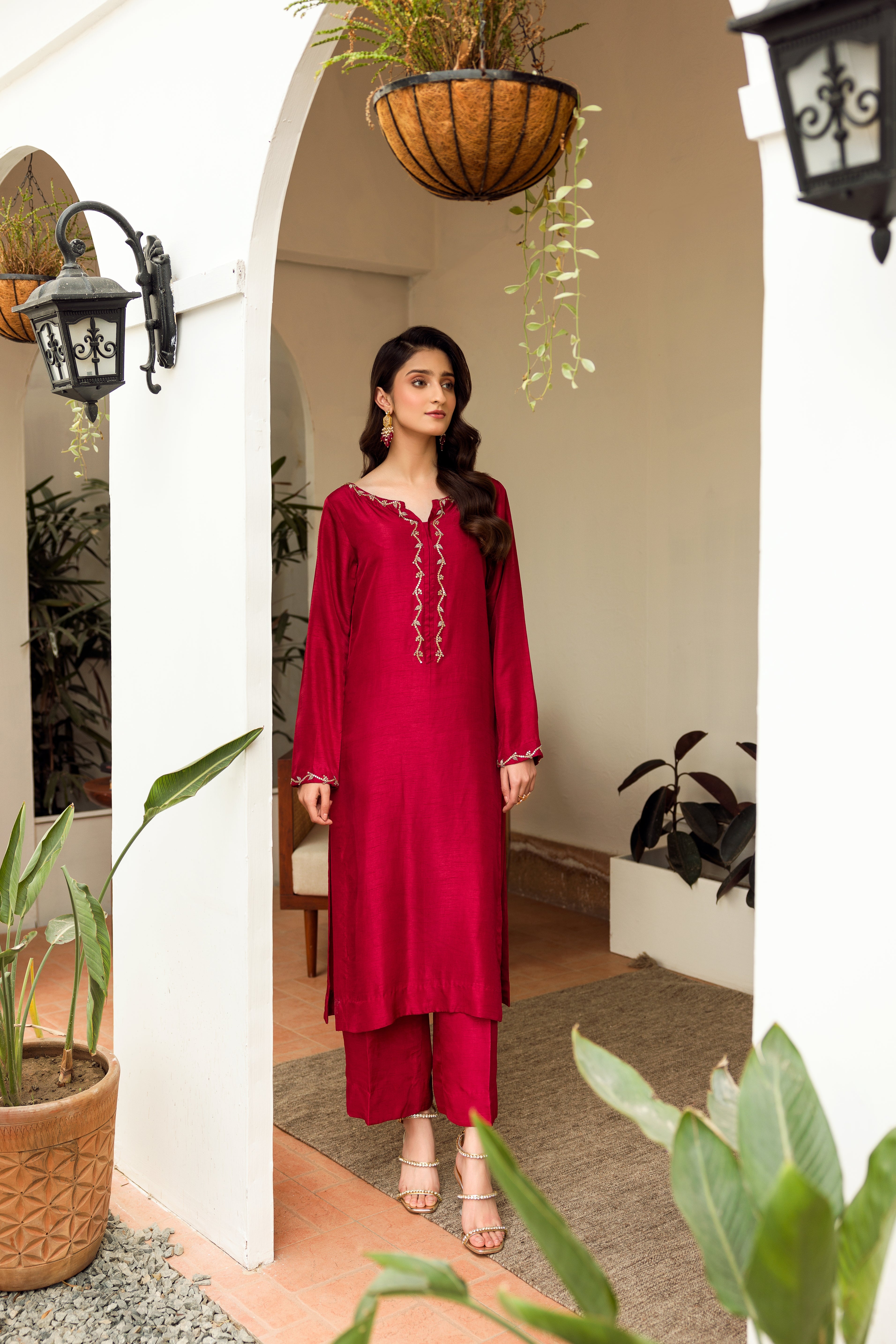 A ravishing red two Piece ensemble crafted from Korean Raw Silk. Meticulously hand embellished with golden sequins and dabka work, this outfit exudes opulence and allure. Elevate your wardrobe with "Zuri" and make a bold statement of elegance and glamour at any event.